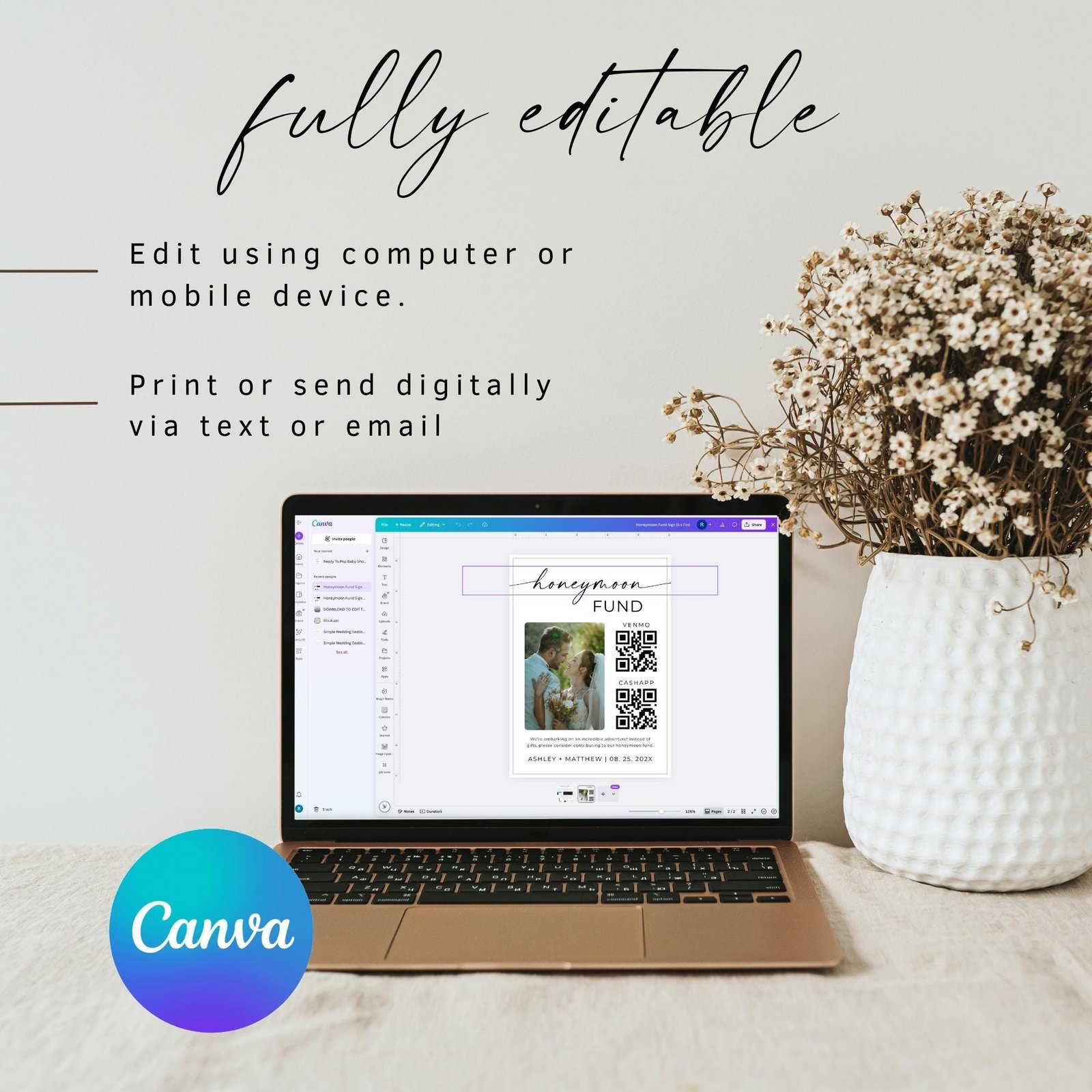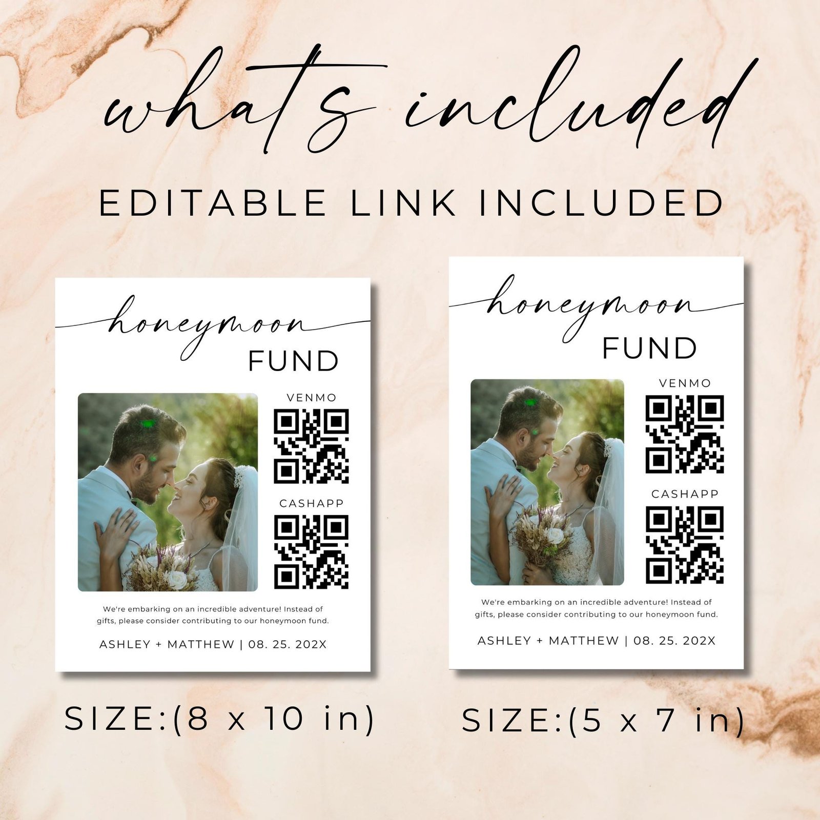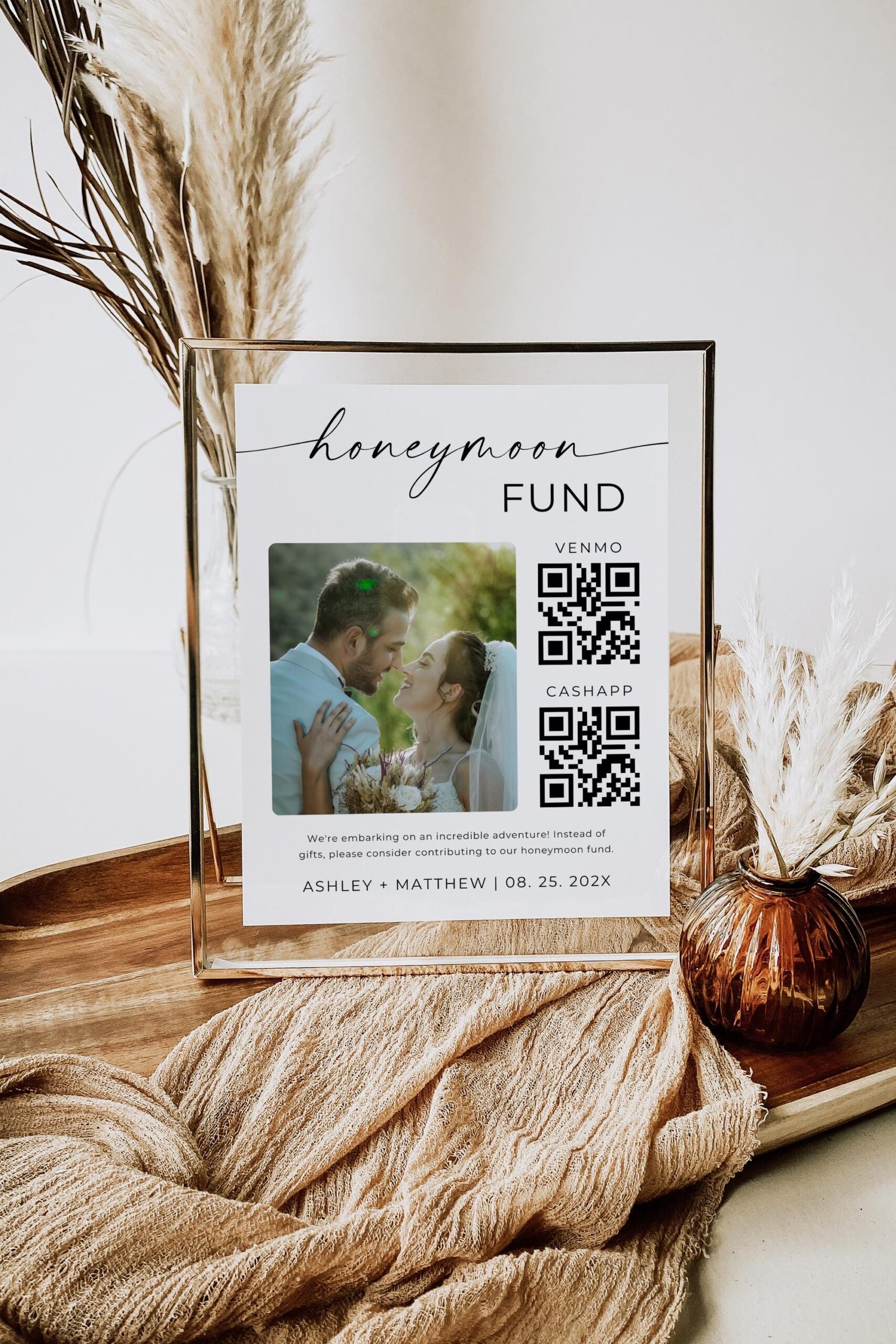 Make your big day even more memorable with a modern twist on gift-giving. The Honeymoon Fund Wedding Sign QR Code allows guests to easily donate to your honeymoon fund by scanning a custom QR code that links directly to your Venmo, PayPal, or preferred payment platform.