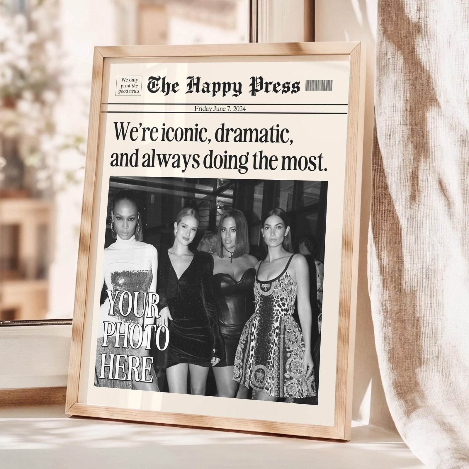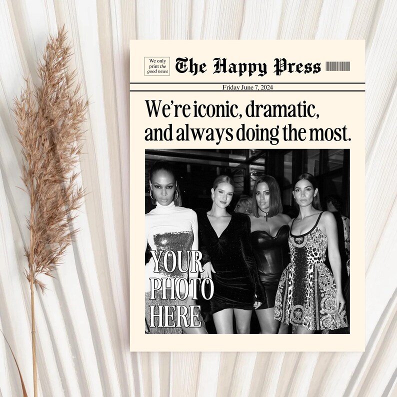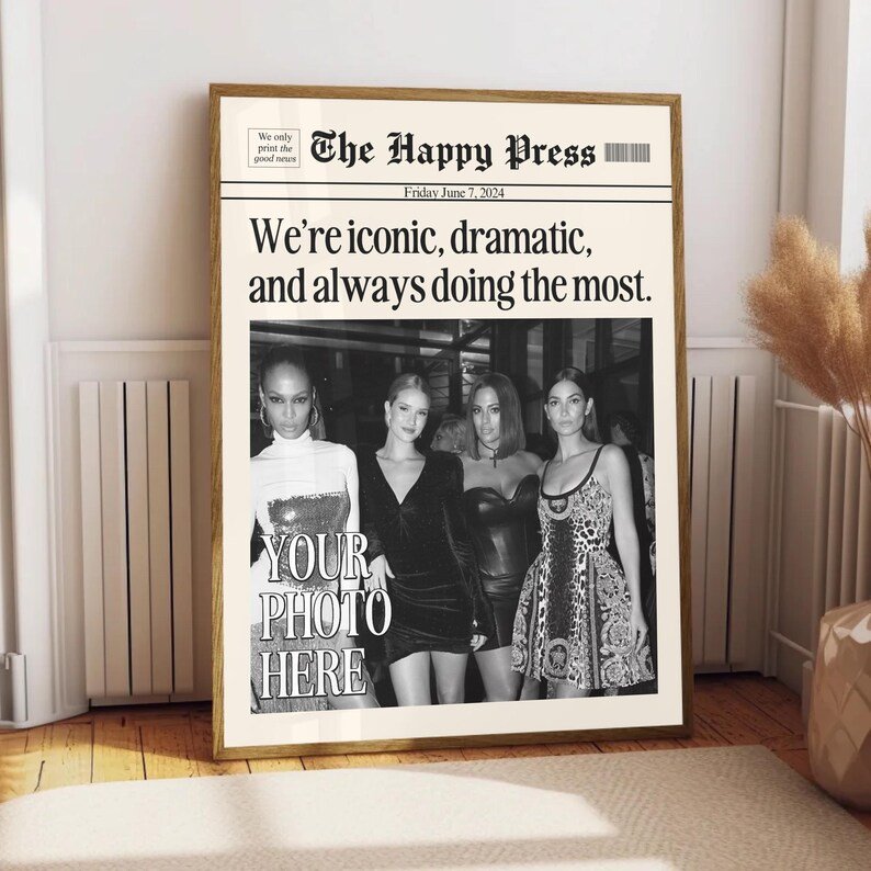 Make your memories timeless with this vintage-inspired custom newspaper print! Whether itâs for your dorm, living room, or as a heartfelt gift, this print will elevate any space with a unique personal touch. Upload your favorite photo, choose your headline, and let me create a piece that feels straight out of a classic newspaper!