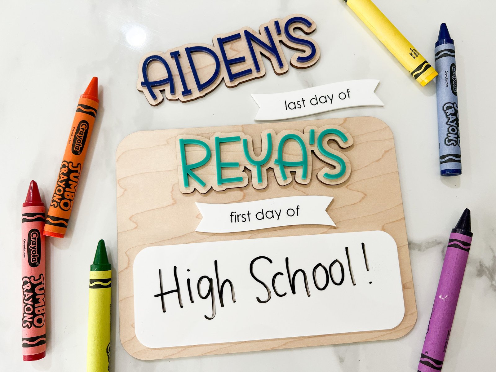 Each board comes with interchangeable headers: “First Day Of” and “Last Day Of”, letting you use it twice a year without buying a new sign.
